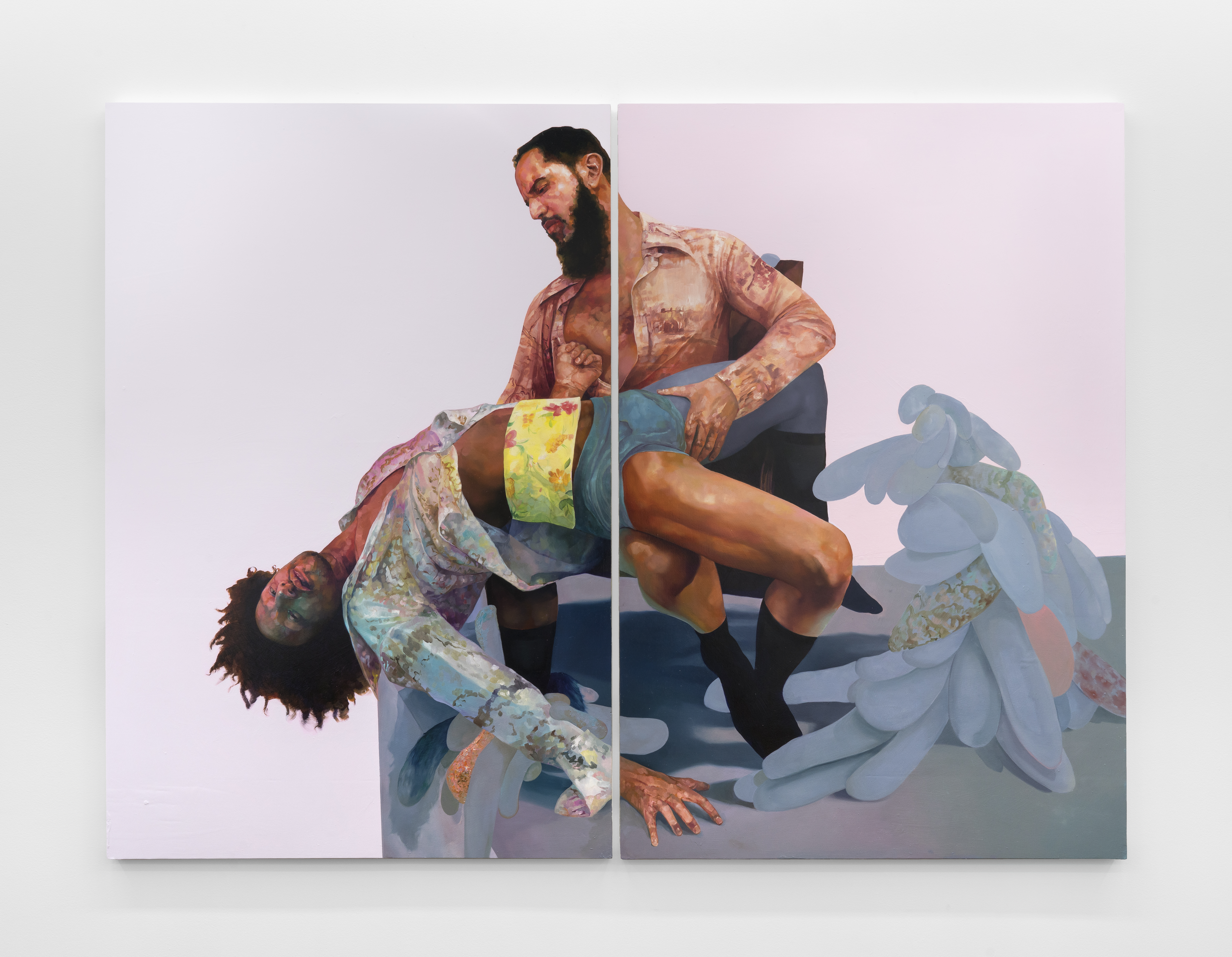 The color pink is also deployed in David Antonio Cruz’s diptych, soletthemeatasylumpink, which belongs to the artist’s returnofthedirtyboys/girls series. The title is a reference to Marie Antoinette, wife of the deposed King Louis XVI, to whom the phrase “let them eat cake” is attributed, along with the decadence and exploitation